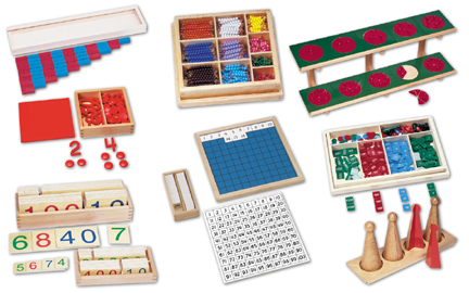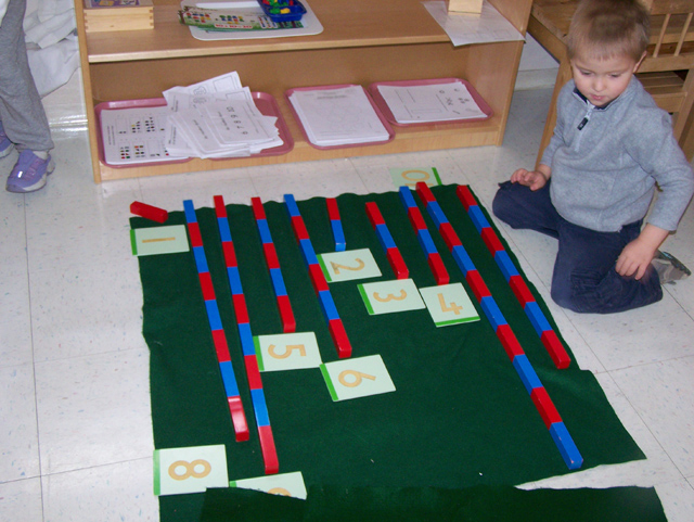 Through concrete manipulative math materials the child internalizes the concepts of number, symbol, sequence operations, and memorization of basic facts. This is first taught through concrete experiences in the Montessori preschool.